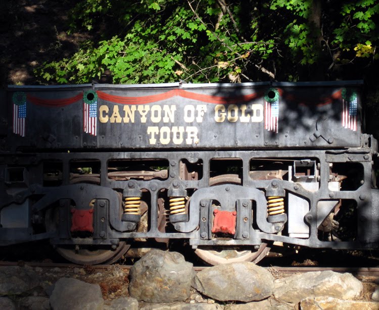 After crossing the creek on a bridge, the tour culminates at a large flat occupied by former Bullion and Webster Cities. Here, the density of interesting things to see rises significantly and you risk missing some hidden gems unless you park and venture out on foot or bike. Highlights to look for are several miners' cabins, the Bully Boy Mill which is nearly dwarfed by tall aspen, and Miners' Park - an informative outdoor museum full of artifacts from Bullion Canyon's glory days as a major gold producer.